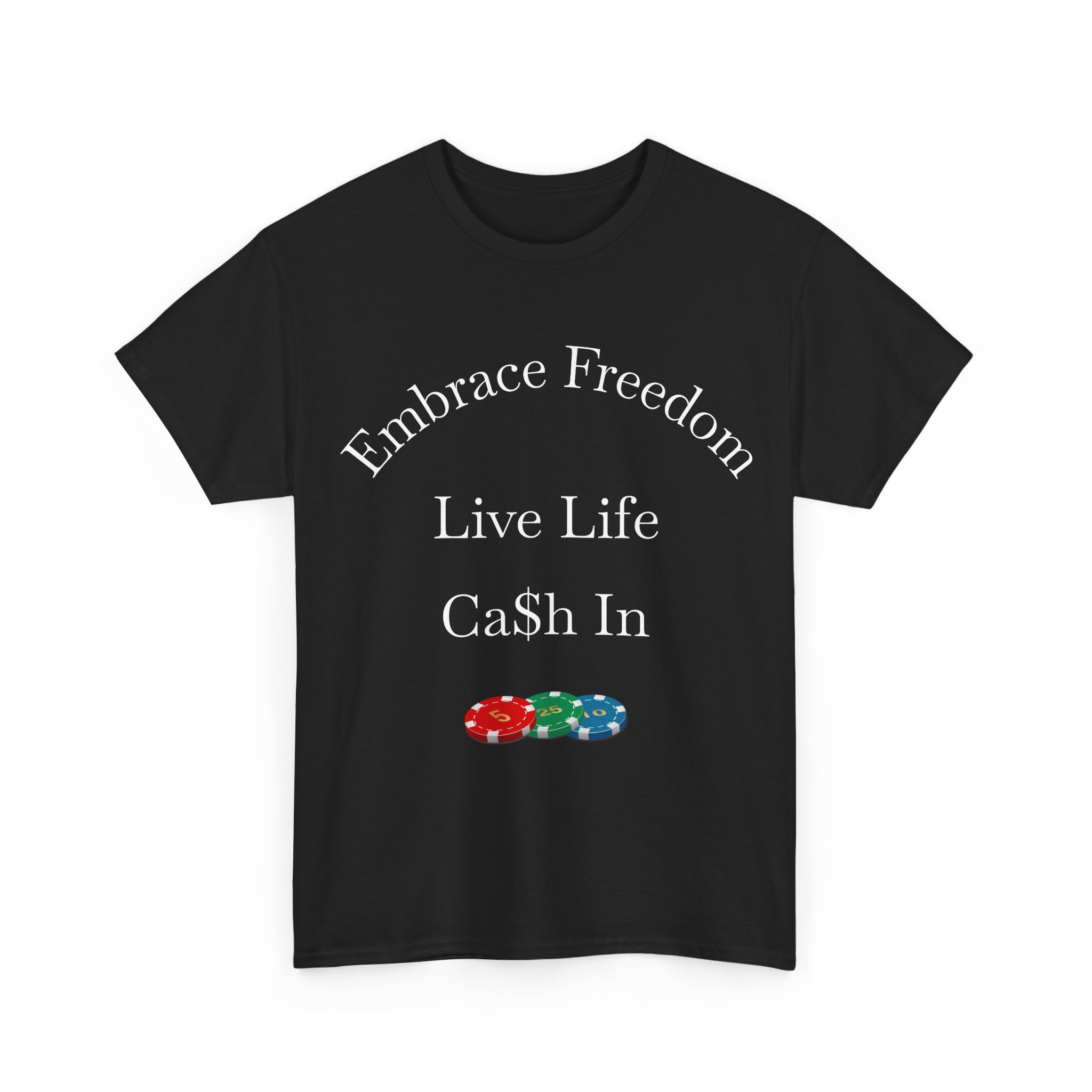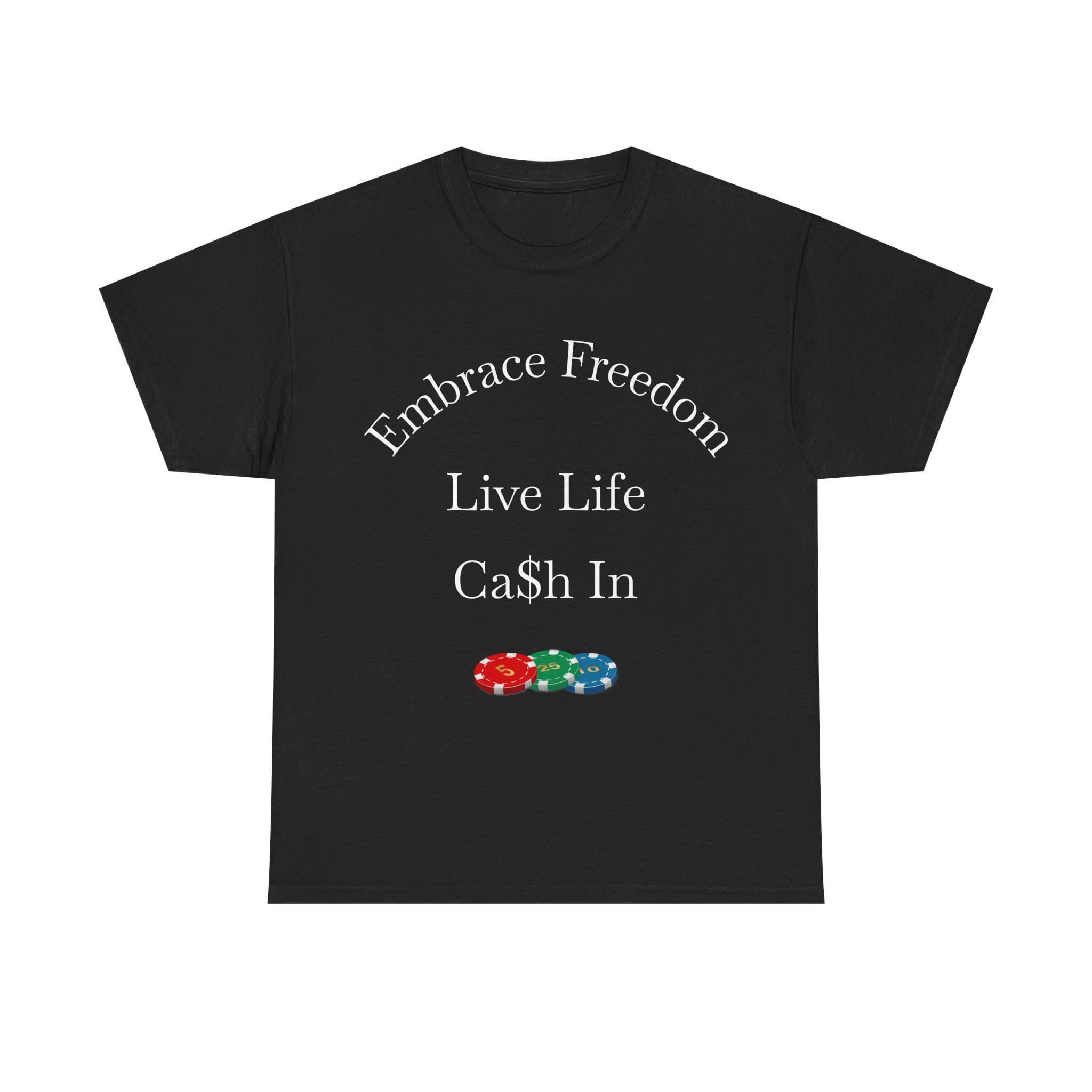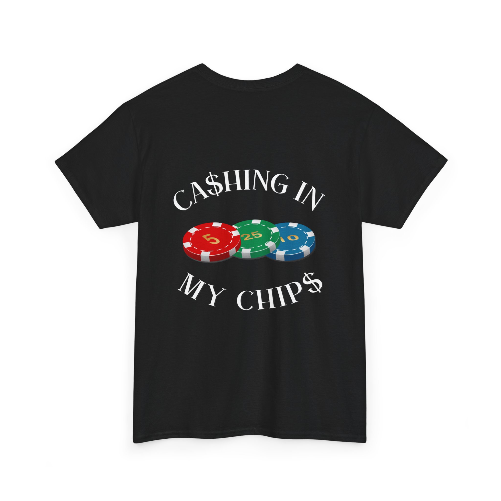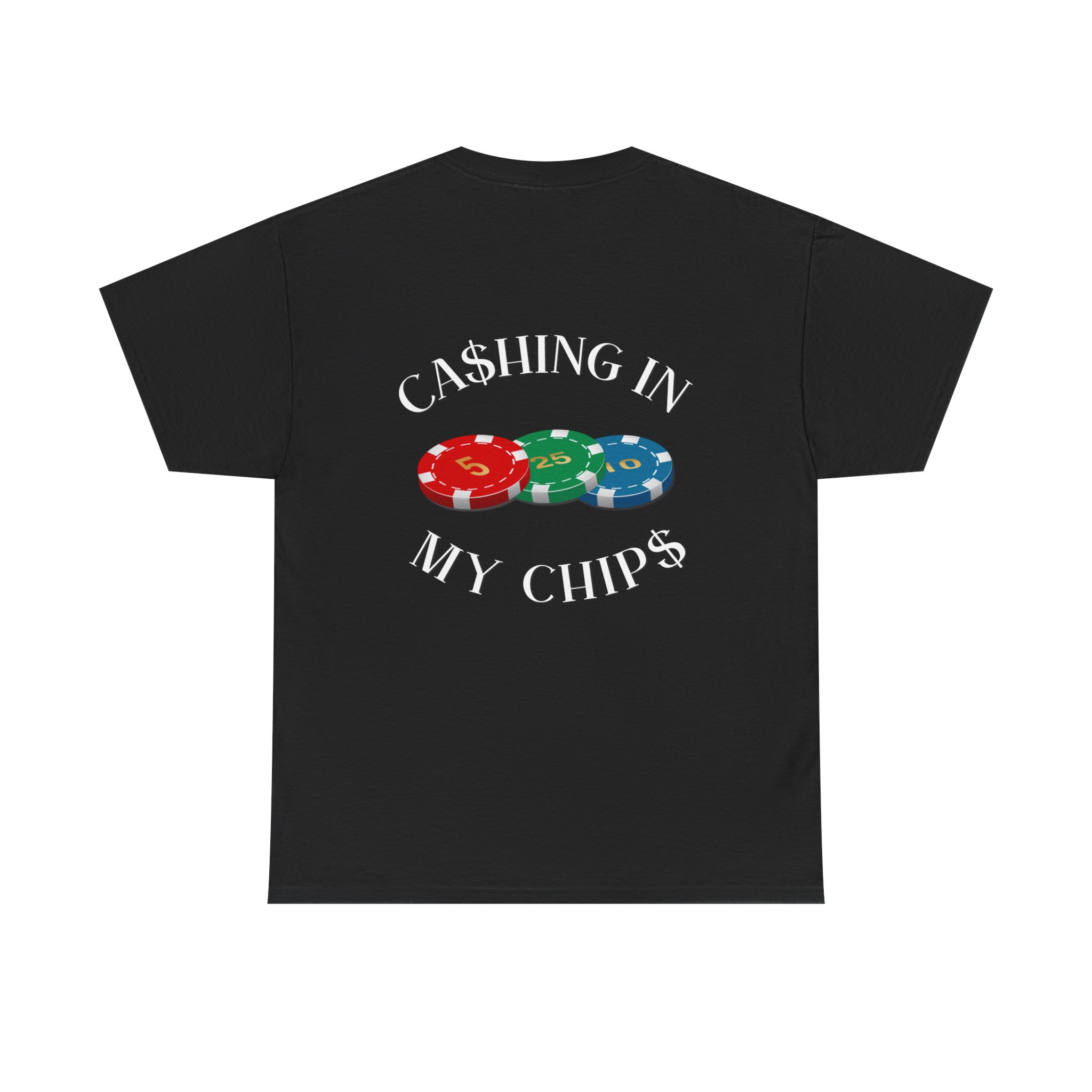Lightweight, straight-cut tee with a bold, playful back print that reads “CASHING IN MY CHIPS” wrapped around a stack of colorful poker chips. The cotton body feels sturdy yet breathable — made for long nights at the table or casual days out. The ribbed collar and taped shoulders keep the shape after washes. The design sits on the upper back, giving the shirt a low-key, confident vibe that speaks to players who celebrate wins with a wink. Wear it to casino nights, poker meetups, or whenever you want to carry a little luck with you.